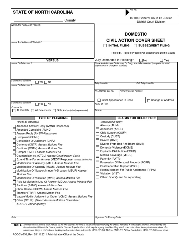 Form Aoc Cv 750 Download Fillable Pdf Or Fill Online Domestic Civil Action Cover Sheet North Carolina Templateroller